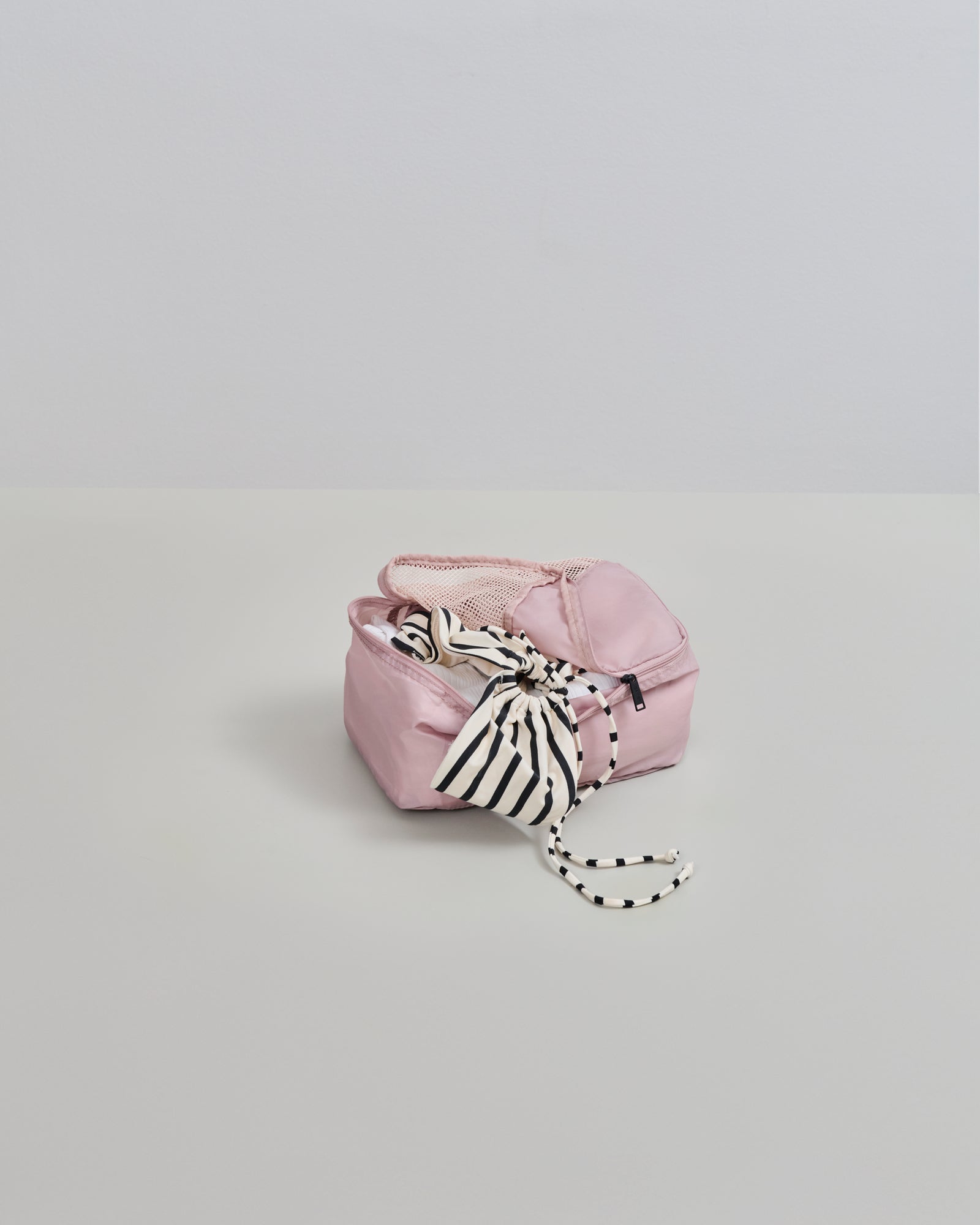 This set of packing cubes includes sizes S, M, and L, designed to help you organize your belongings when packing your suitcase. The main fabric are made of lightweight certified recycled materials and feature zipper closures. Each packing cube is equipped with a mesh top for easy visibility of your packed items.