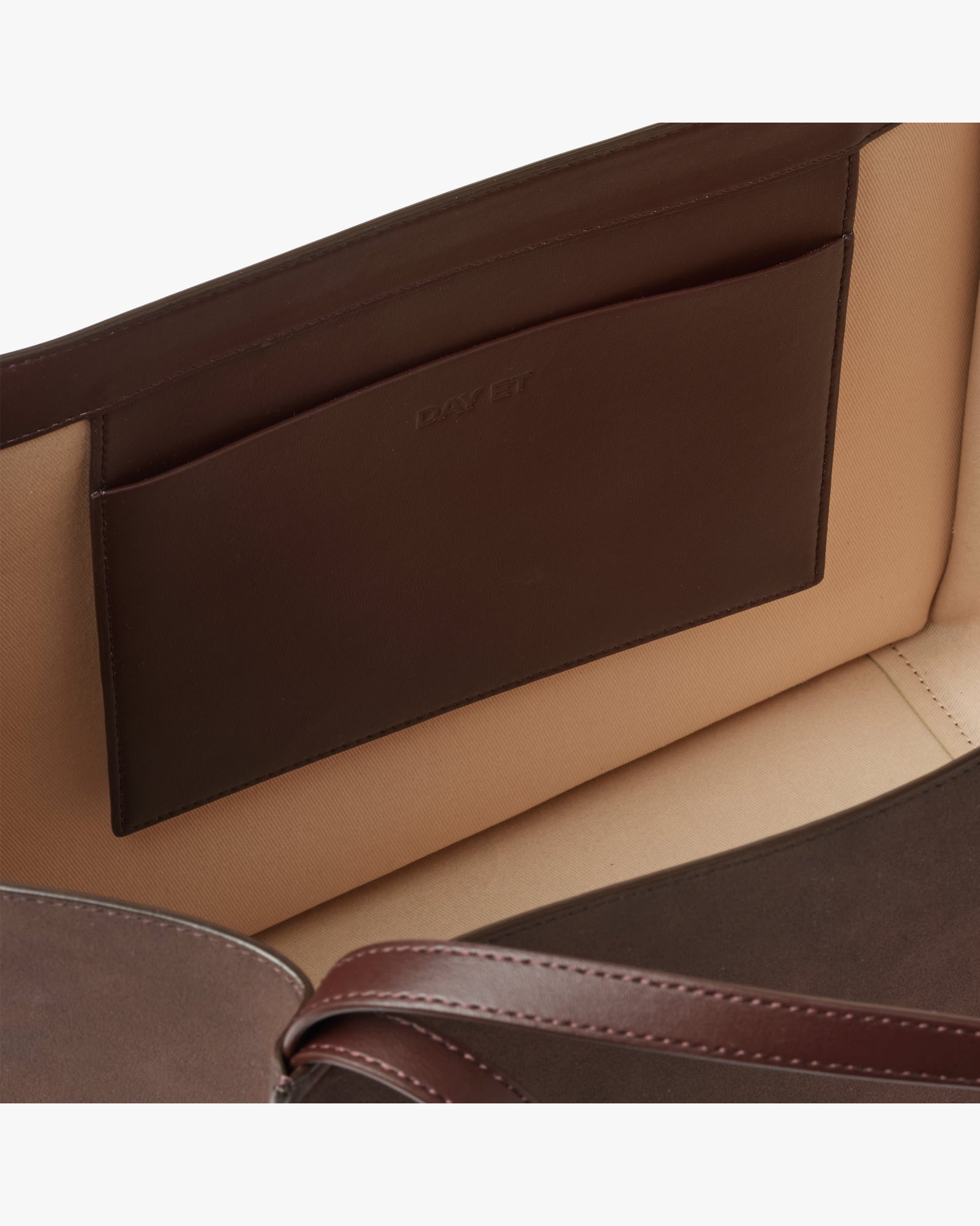 This spacious shoulder bag has a sculptural shape and is made from soft faux suede with faux leather details. It has both handles and shoulder straps, as well as a firm base that provides structure. Inside, it has a light twill lining and an open pocket.