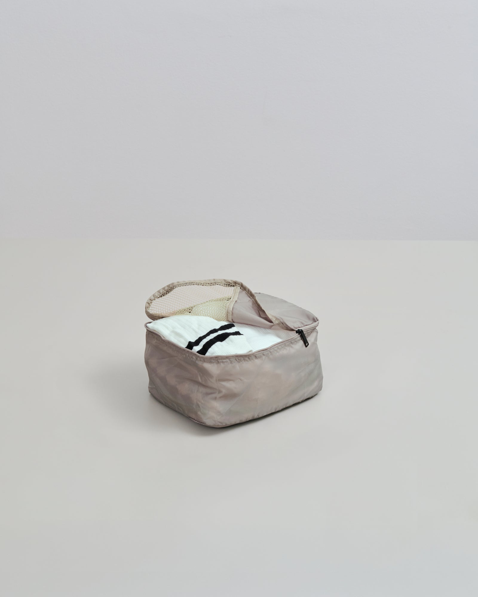 This set of packing cubes includes sizes S, M, and L, designed to help you organize your belongings when packing your suitcase. The main fabric are made of lightweight certified recycled materials and feature zipper closures. Each packing cube is equipped with a mesh top for easy visibility of your packed items.