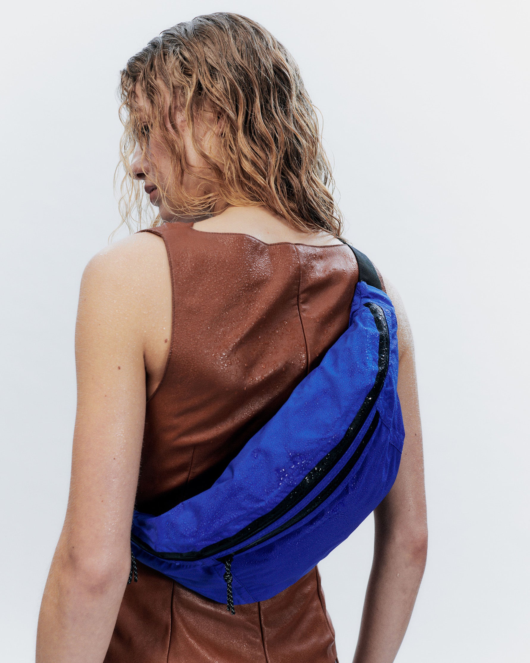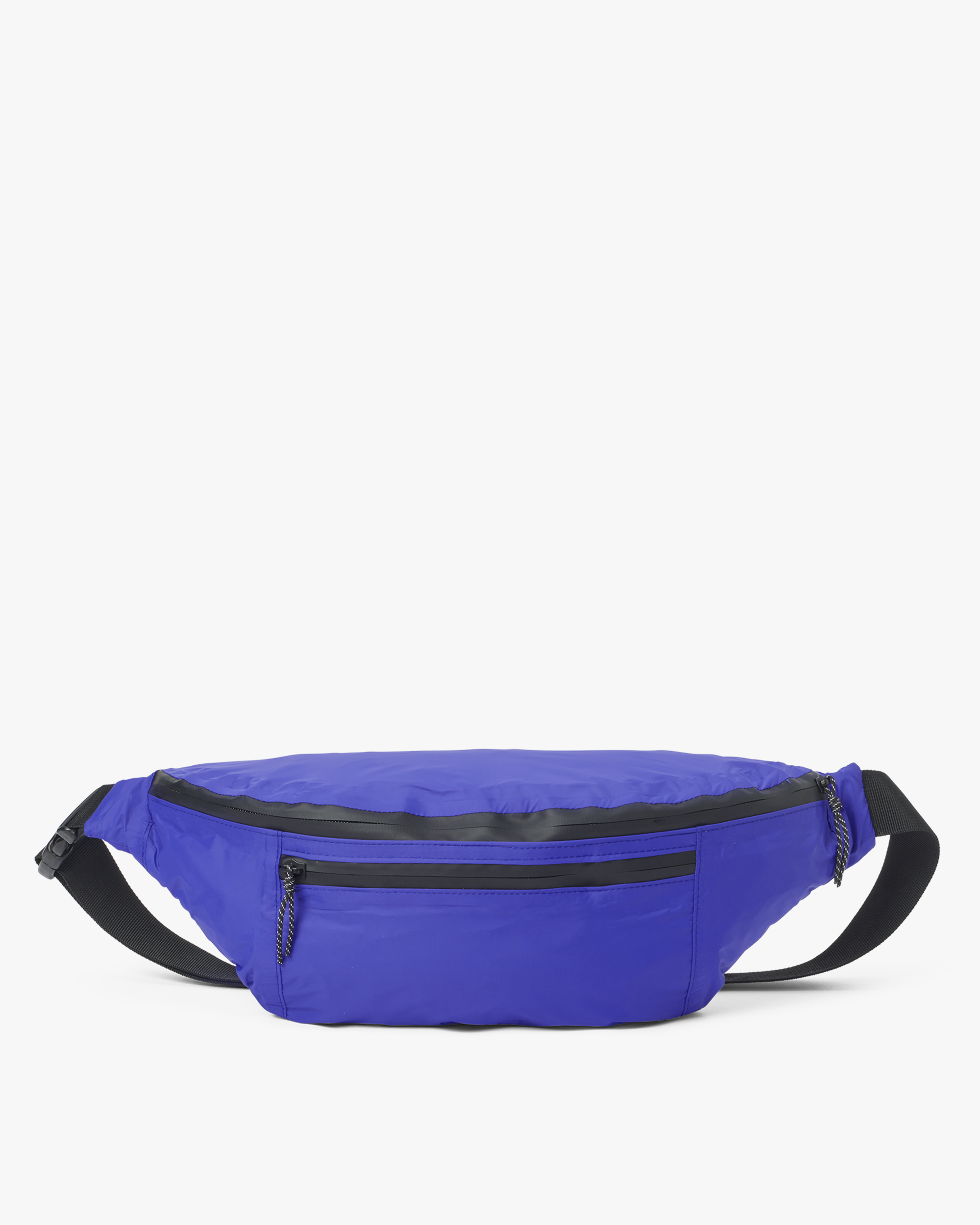 This functional unisex bum bag is designed in a 100% certified recycled water-repellent material, capable of withstanding a water column pressure of 2100 mm. It features a waterproof zipper and includes both an internal and an external pocket for convenient storage. The strap of the bag is adjustable with a buckle, allowing for customisation to fit your preference. It can be worn as a crossbody or around the stomach, and is made from a lightweight material.