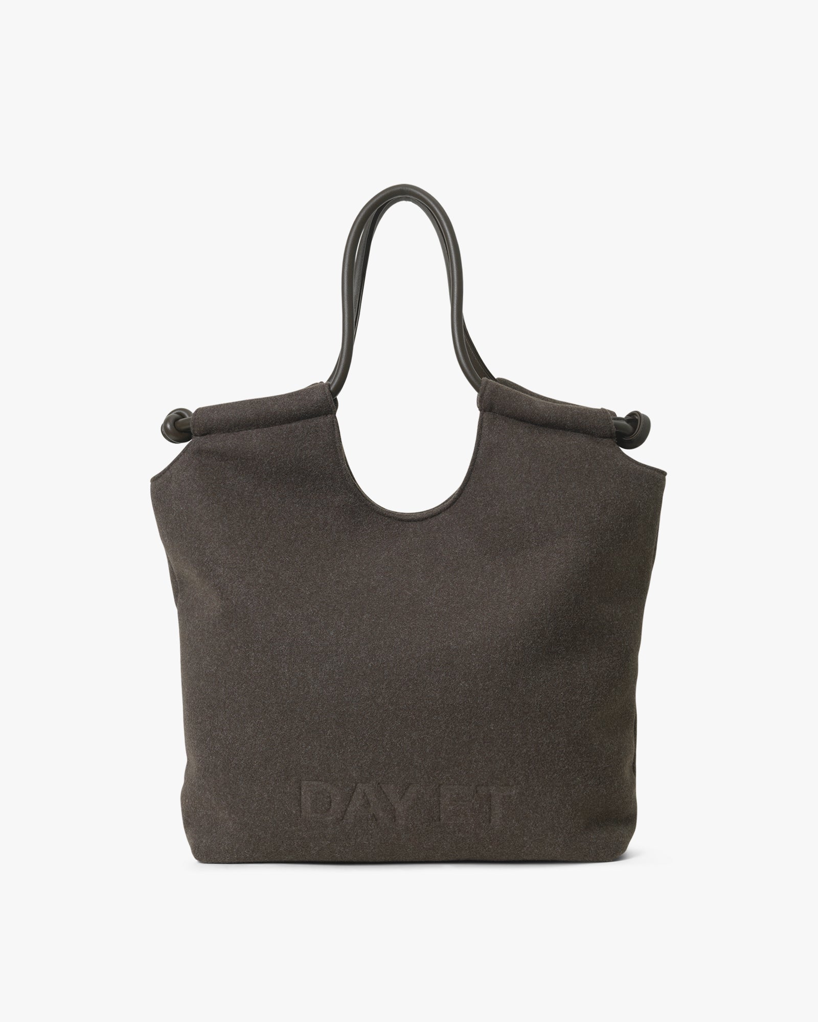 A spacious tote bag made from soft woollen material, offering a warm and understated look. It accommodates a 15" laptop and secures with a press-stud closure. Inside, there's a practical zip pocket, and the faux leather handle with knotted detail adds a subtle, distinctive touch. A bag that blends functionality with elegant design.