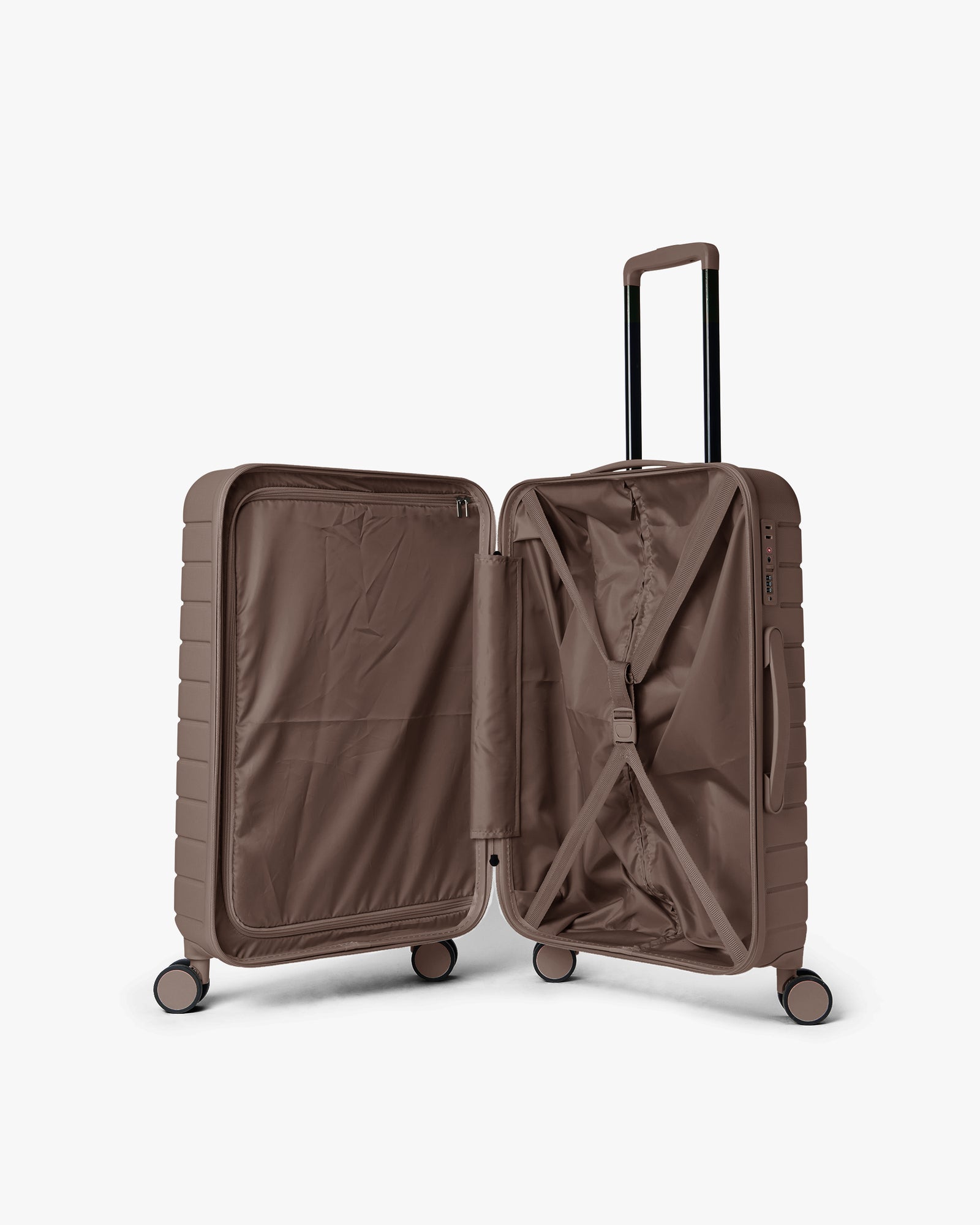 This functional suitcase is equipped with a zippered compartment and packing straps, allowing you to keep track of all your belongings in a classic design. It can hold up to 65 litres and has 4 double wheels that can rotate 360 degrees, so you can push it around without any problems. The suitcase is made of a lightweight and durable hard-shell material and has a TSA-approved lock to keep your belongings safe. It features a tonal design with the classic Day Et logo on the front.