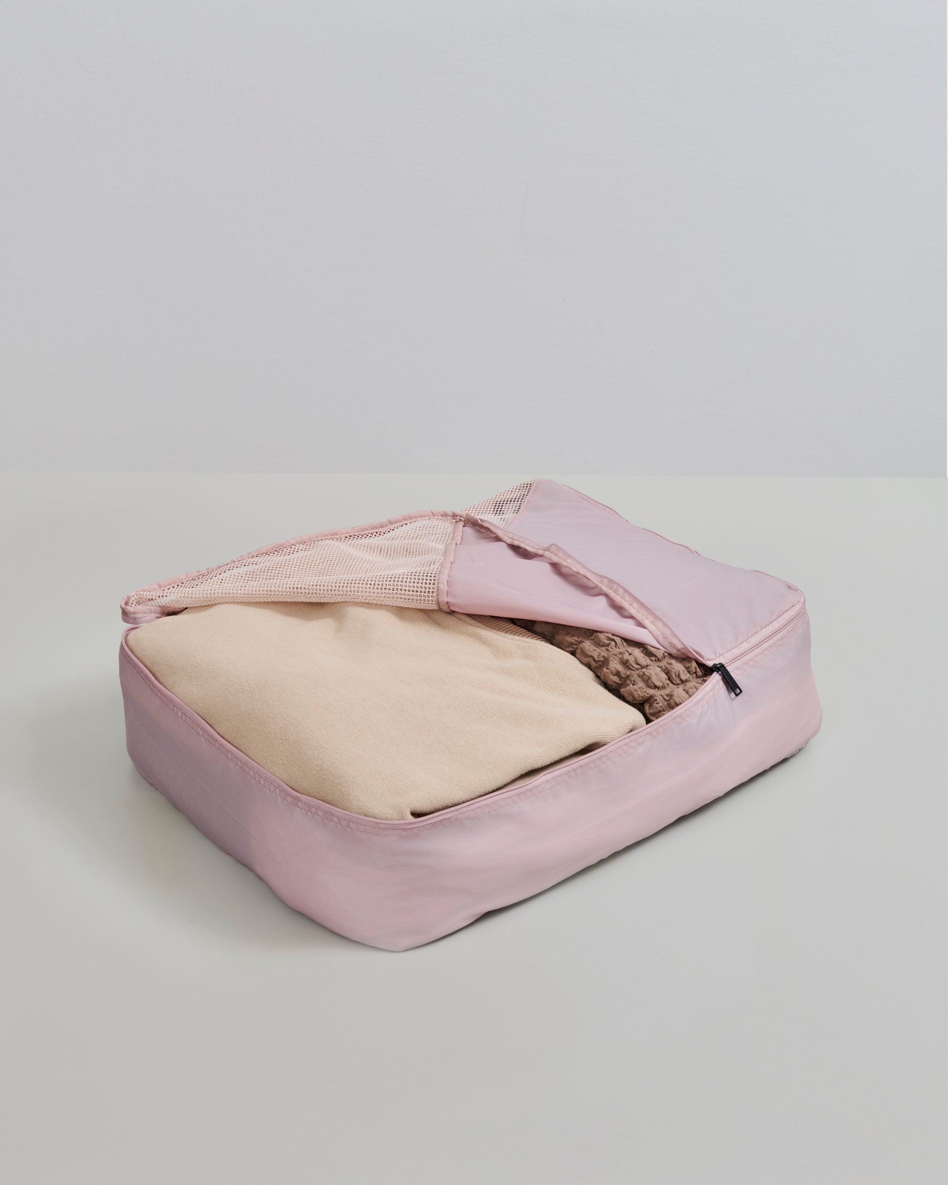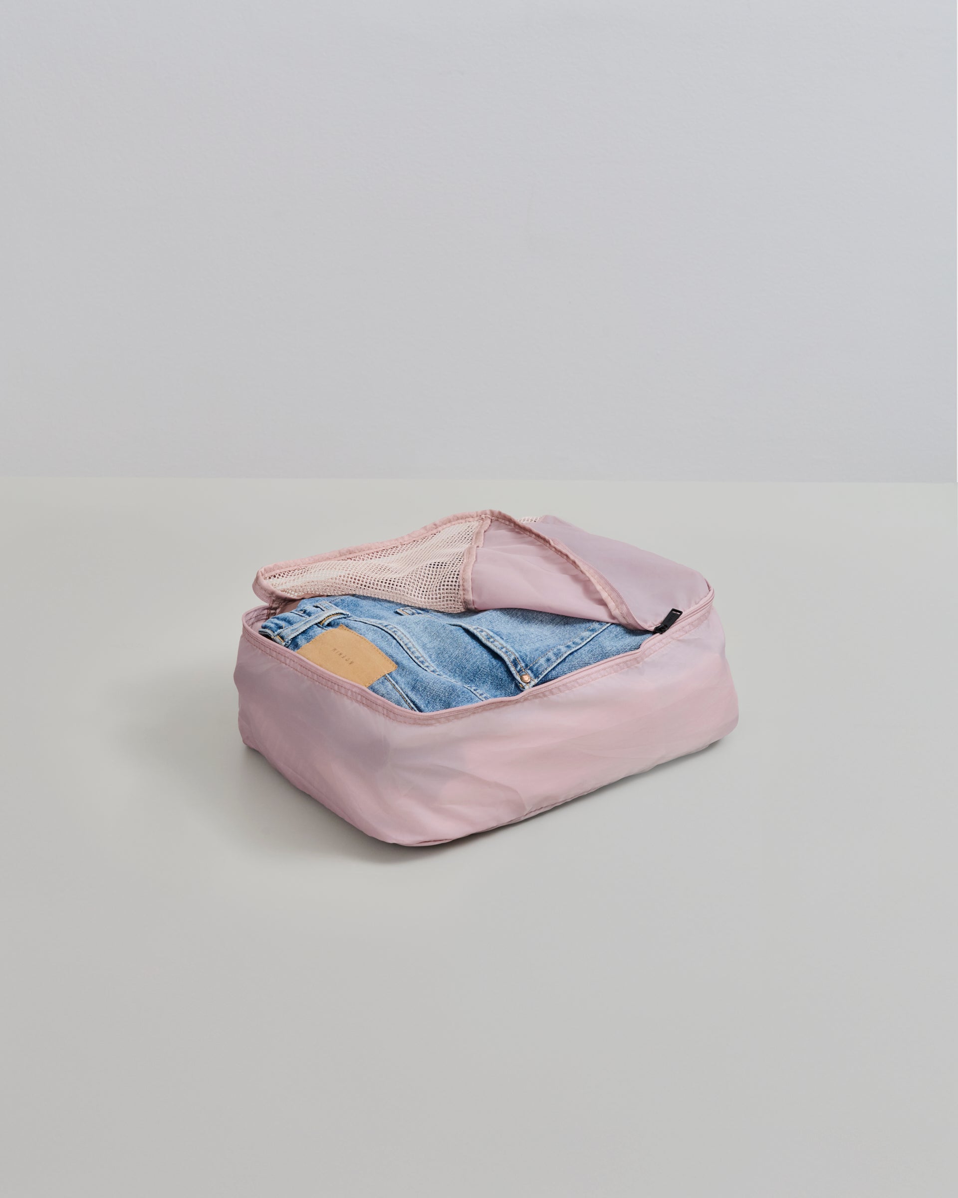 This set of packing cubes includes sizes S, M, and L, designed to help you organize your belongings when packing your suitcase. The main fabric are made of lightweight certified recycled materials and feature zipper closures. Each packing cube is equipped with a mesh top for easy visibility of your packed items.