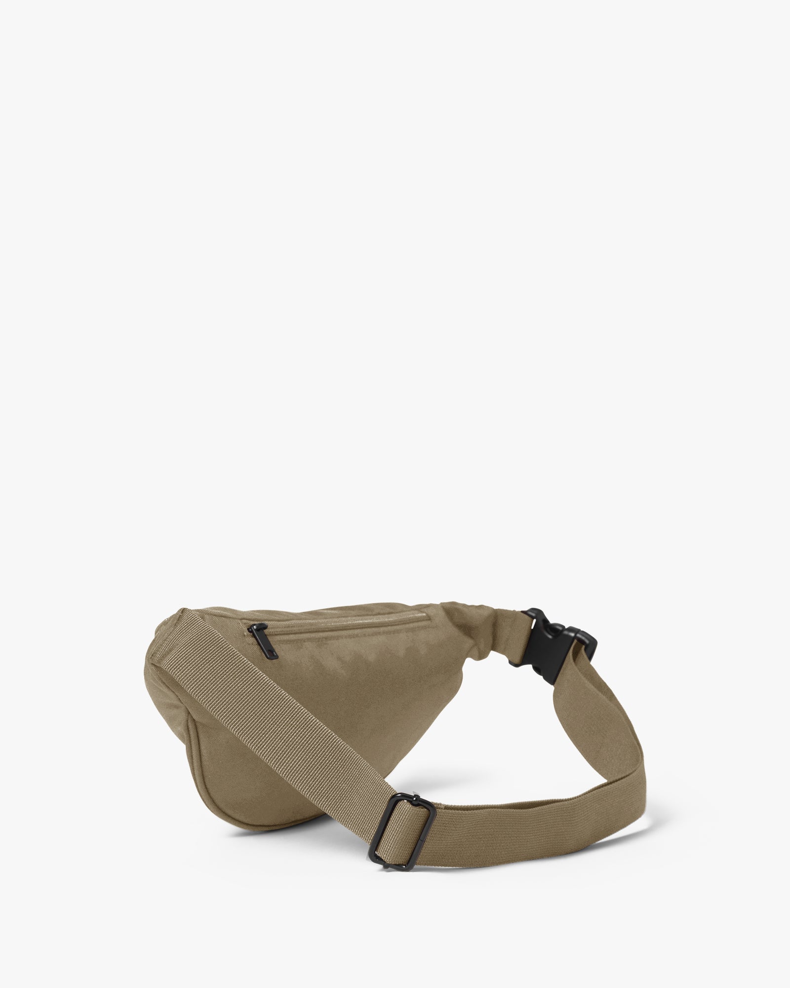 Denne bæltetaske kombinerer et tonalt design med funktionelle detaljer. Den har en justerbar strop med spænde, så den kan bæres både omkring livet og som crossbody. Hovedrummet lukkes med lynlås og har en indvendig lomme samt en ekstra lynlåslomme på bagsiden. Taskens yderstof og inderfor er lavet af 100% certificeret genanvendt materiale, og den rummer op til 1,5 liter.