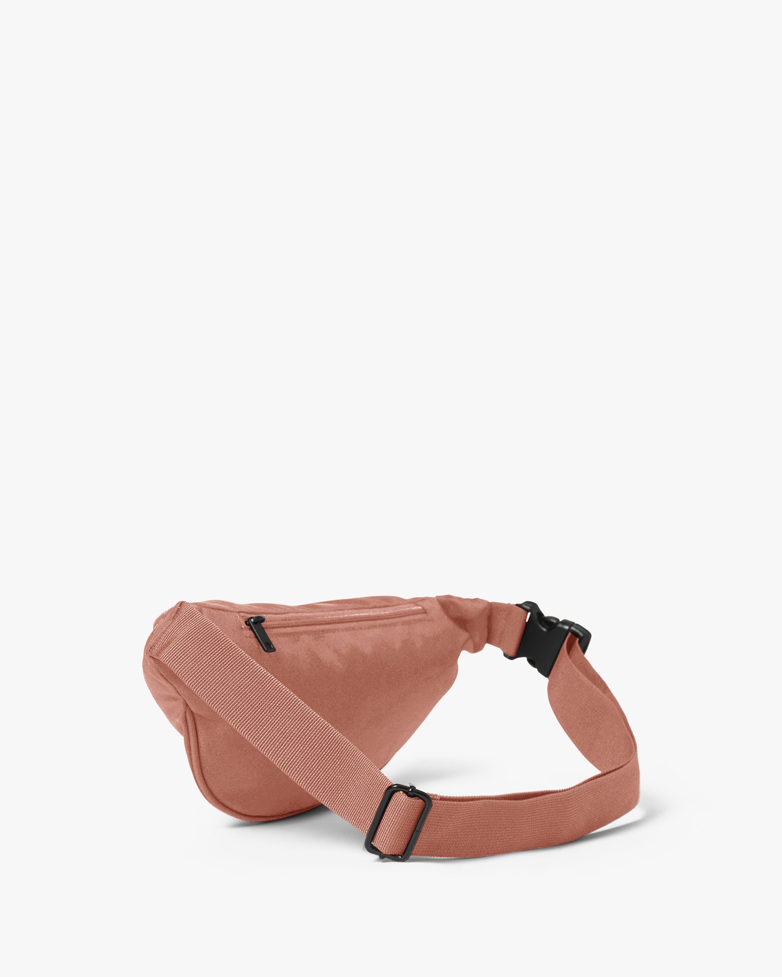 Denne bæltetaske kombinerer et tonalt design med funktionelle detaljer. Den har en justerbar strop med spænde, så den kan bæres både omkring livet og som crossbody. Hovedrummet lukkes med lynlås og har en indvendig lomme samt en ekstra lynlåslomme på bagsiden. Taskens yderstof og inderfor er lavet af 100% certificeret genanvendt materiale, og den rummer op til 1,5 liter.