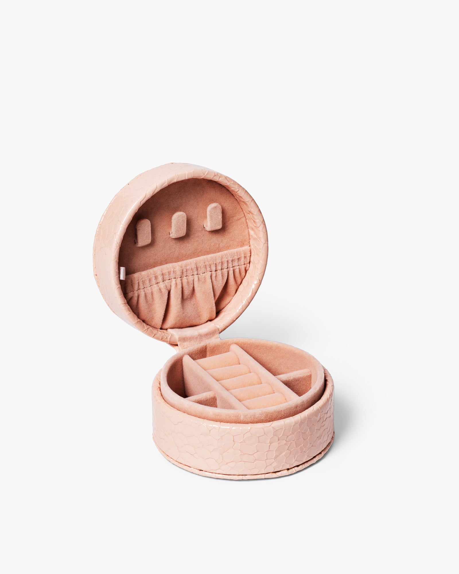 Dette lille smykkeskrin er perfekt til opbevaring af dine yndlingssmykker både i hjemmet og på farten. Det er designet i et materiale med krakeleret lædereffekt og beskytter dine smykker og holder dem organiserede.