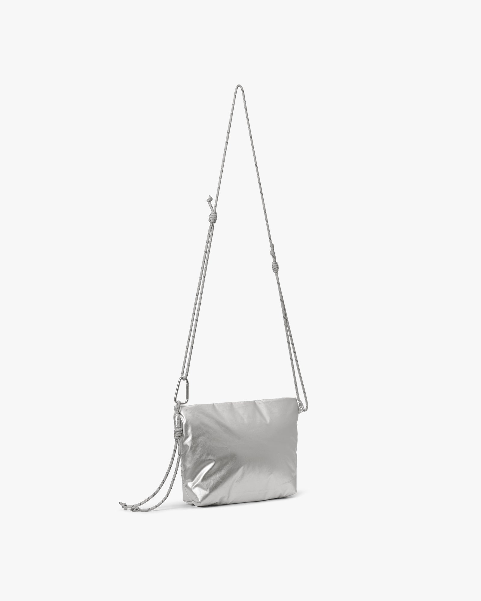 En kompakt crossbody i polstret, skinnende materiale med en praktisk rumdeler i net, der opdeler hovedrummet. Tasken lukkes med en sænket lynlås med snordetalje, og stroppen i paracord er justerbar. Karabinhagen gør det nemt at tage tasken af og på – perfekt til dage, hvor du har brug for hurtig adgang eller vil fastgøre den til en større taske.