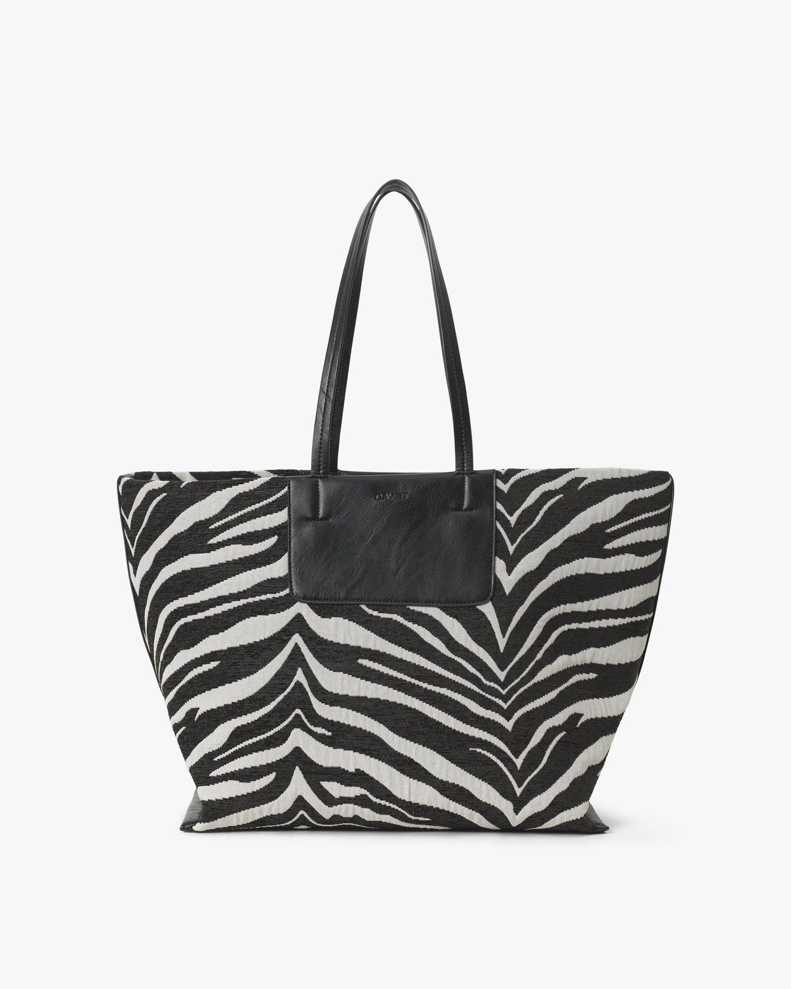 En skuldertaske i en klassisk form med fast bund og plads til en 13" computer – ideel til både arbejde og hverdag. Tasken er designet med et karakteristisk jacquardvævet materiale med zebra-mønster, detaljer i imiteret læder med præget logo og et lyst twillfor. Indvendigt finder du en åben lomme og en lynlåslomme, som gør det nemt at organisere dine ting. En funktionel favorit, der er nem at style til enhver garderobe.